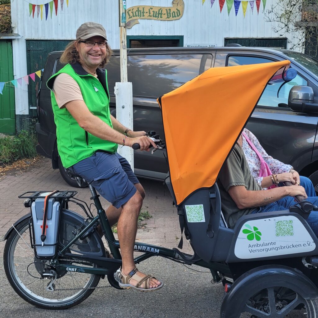 Seit 2022 unterhält unser Verein das Projekt „Rikscha-Fahrten“, mit welchem wir Menschen im hohen Alter oder mit eingeschränkter Mobilität unvergessliche Erlebnisse schenken möchten. In einer Rikscha mit elektrischer Unterstützung unternehmen ehrenamtliche Fahrer:innen (wir nennen sie Pilot:innen) mit Ihnen Ausfahrten in die Stadt, an die Weser, den Werdersee, in den Bürgerpark oder an besondere persönliche Orte.